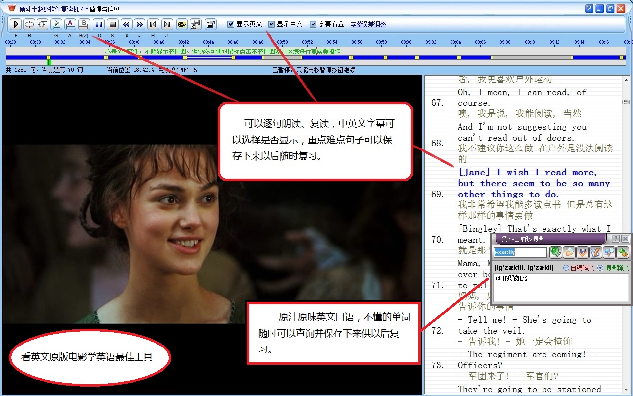 对有字幕文件(.srt,.smi,.ass)的视频资料,视频播放到哪里,对应的字幕就被放大、高亮显示。对字幕中不认识的单词,可以鼠标即点即查,还可以做上标记,摘录生词。点击某一行字幕,视频立即会跳到该行字幕应该出现的时间。
