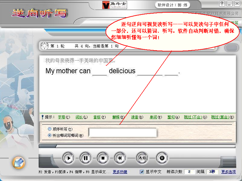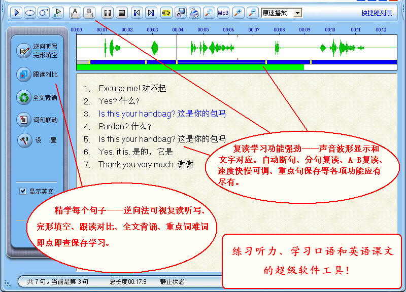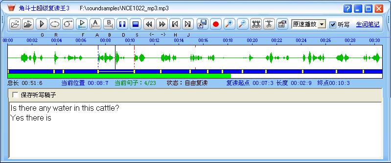 支持逐句复读、A-B复读、自由复读(可随意指定复读任何一段,并随时调节复读起点、终点);复读时间无限长;MP3文件全程波形可视,根据波形,能一眼就能看出哪里是句子开头甚至单词开头,实现精确复读一个句子,甚至一个单词!