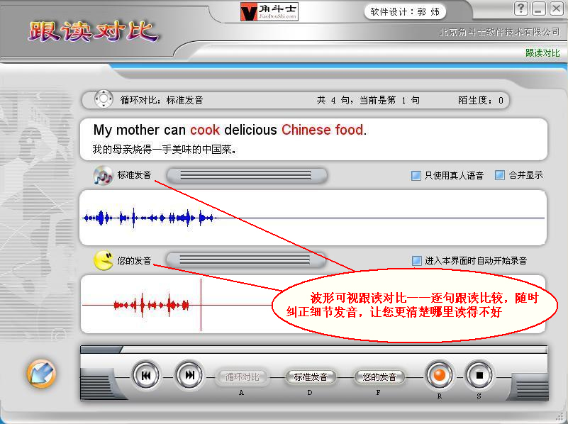 跟读对比功能迅速提高您的口语水平,对于MP3文件,还可进行波形可视跟读对比,让您更清楚哪里读得不好。 本软件中还可以进行听写练习,听写的文字可以保存。