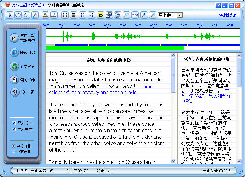 磁带复读机曾是广大英语学习者的必备工具。但是近几年来,磁带的发行量迅速下降,英语书籍往往不再配磁带,而是改配MP3光盘。网上也有大量MP3格式的英语学习资料以及英文原版电影,内容几乎是包罗万有(点击下载)。因此,用电脑或MP3机学英语,已经成为不可逆转的潮流。用电脑播放MP3文件听力材料或者英文原版电影,比起MP3机等设备,又有便于操作,便于文字对照、听写、保存等优点。虽然很多播放软件都可以播放,但是这些播放软件都不是专门为英语学习设计,因此没有英语学习所必需的各种功能,比如复读、跟读对比、听写、难句摘录等。《角斗士超级软件复读机》是专门针对英语学习而设计的电脑复读机软件,具有很强大的复读、跟读、听写练习等功能,大大提高您练习听力、学习口语和英语课文的效率,还能对英文电影进行复读、跟读、听写,是您看电影学英语的极佳工具!