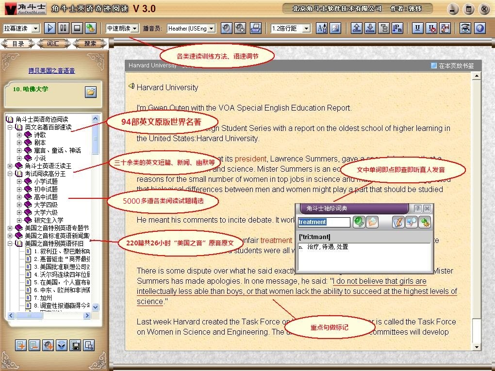本软件包含数千万字的海量的阅读材料,包括94部英文原版世界名著,还收入五百多万字的英文泛读材料,涵盖 新闻、社评、影视、音乐、访谈、历史、幽默、笑话、经典散文、短篇小说、名人小传、名人书信、著名演说等,内容时新,极具趣味性和时代感,从此您不必再上各种网站寻觅阅读材料! 许多文章用鲜活的当代美国口语写成,覆盖当代美国文化的方方面面,对您掌握地道美国口语、听懂美国大片、美语新闻均大有帮助。使您迅速了解美国当代文化背景,为流利地与美国人交流、侃大山,尽快溶入美国社会极具作用!从此后您在和老外谈天时不会出现听不懂其引用的典故、人物、事件等的尴尬,听到纯粹的美式笑话也能和美国人一起会心一笑了!考试阅读轻取高分!《角斗士英语奇迹阅读3》还收入中学、大学四六级、研究生等阅读考试题五千余道,辅以专门对付考试的速读训练功能,从此您在各类英语阅读考试中再也不会因时间不够而丢分了。