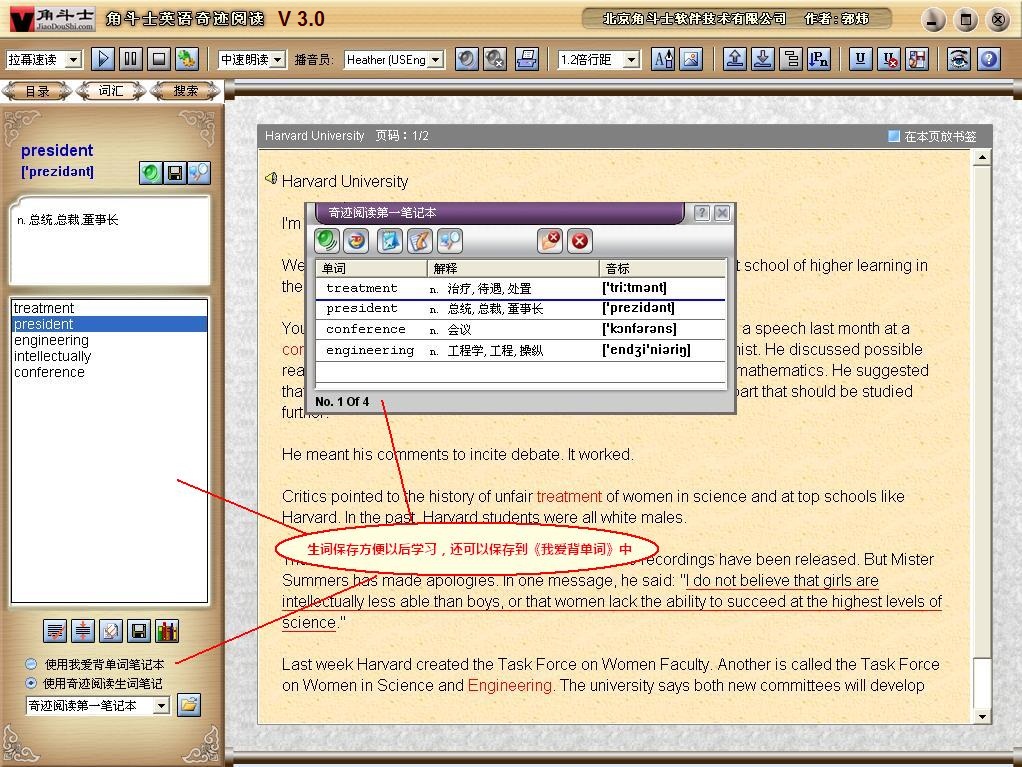 鼠标左键点击文中单词,单词就能能变色做上标记,读几页文章后就可以回头看看碰到过哪些生词!鼠标右键点击单词,就能查找单词解释,听单词发音,还能将生词摘录下来进行复习!