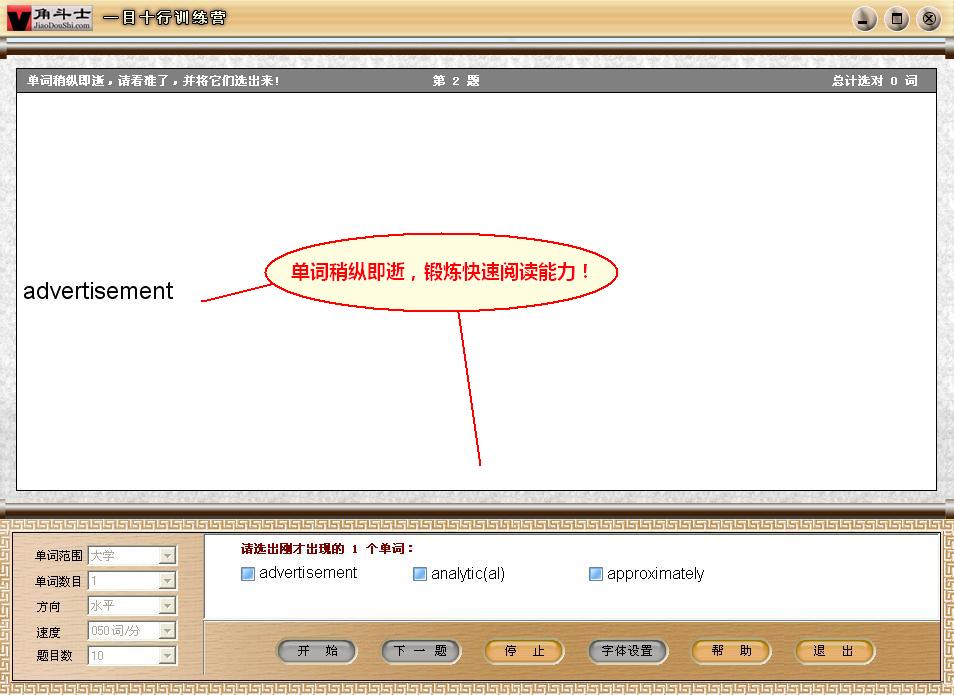 《角斗士英语奇迹阅读3》是一款划时代的英语阅读训练软件,能奇迹般迅速提高您的英文阅读水平。它总结了国内外关于如何培养快速阅读能力的成熟研究成果,训练反应灵敏度,加快眼球移动速度,培养跳读能力,戒除默读和逐词阅读等难以克服的坏习惯! 一目十行训练营、焦点速读、导航速读、跃迁速读、揭幕速读、标靶速读等多种科学手段使您的英文阅读速度在短期内迅速提高4-5倍!