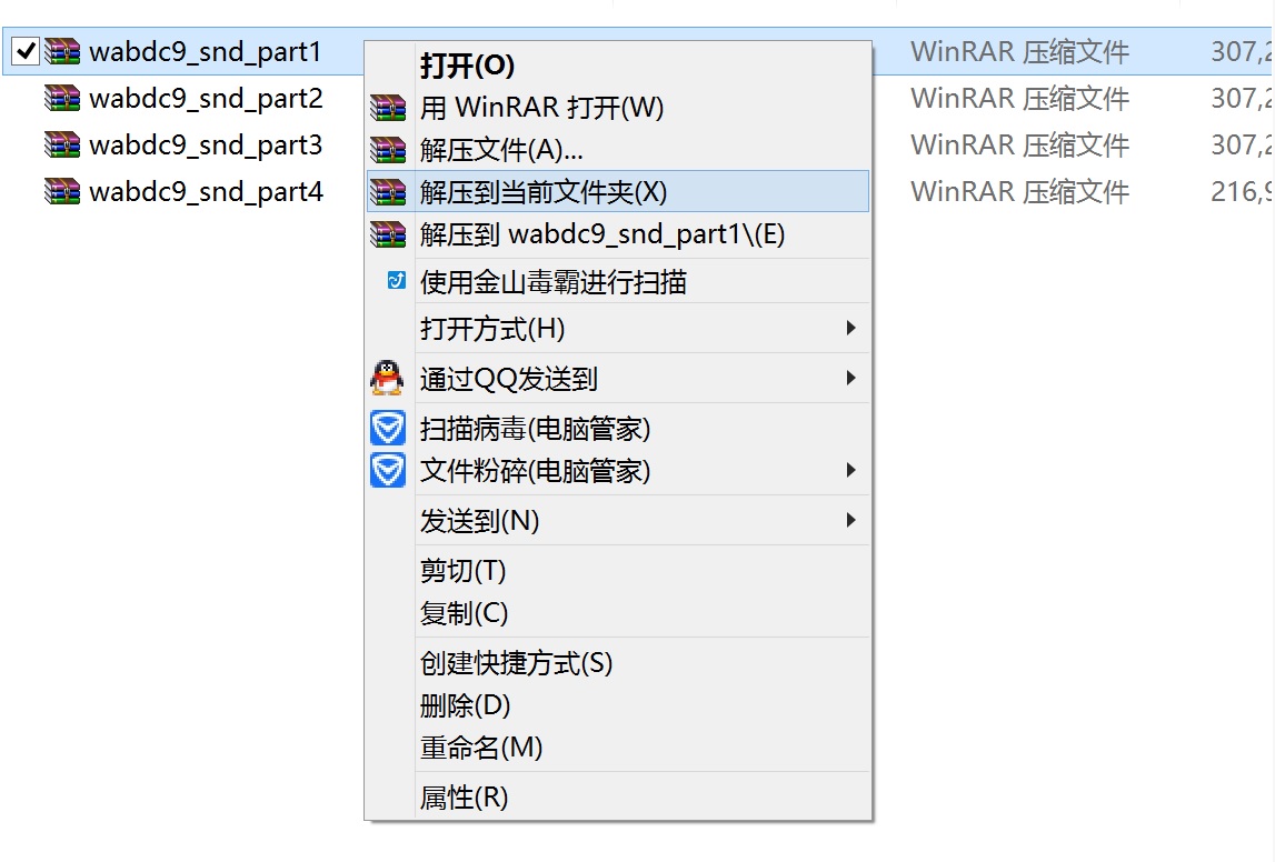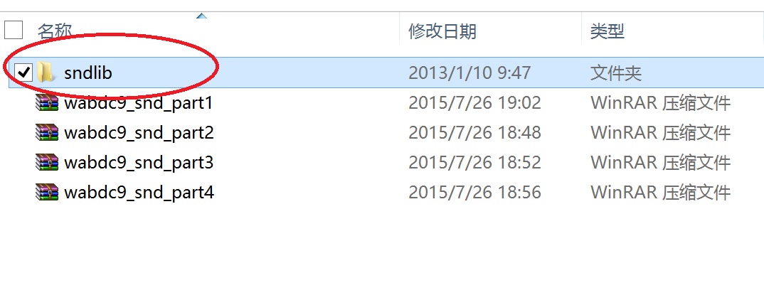 2. wabdc9_snd.part1.rar - wabdc9_snd.part4.rar四个语音文件全部下载完成后,打开存放下载文件的文件夹,解压缩part1(解压缩到当前文件夹), 如下图(左)。注意只要解压缩part1即可,其它三个文件会自动解压。解压后会生成一个sndlib的文件夹(大约1.3G),如下图(右)。