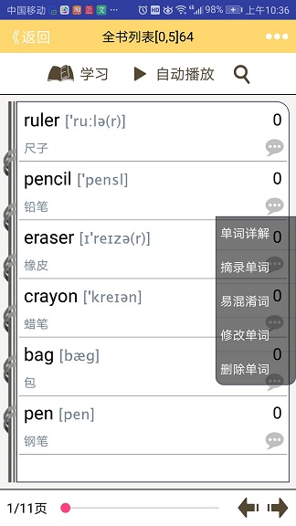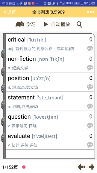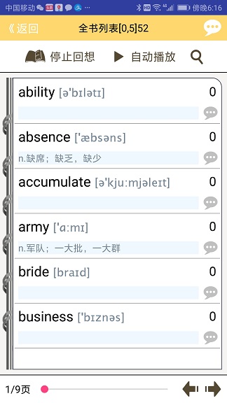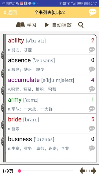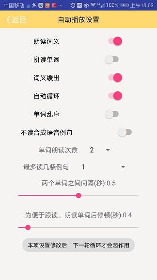 “自动播放”功能可以一个接一个地自动循环朗读单词、进行拼读、读词义、读例句,朗读格式可以自己设定,闭上眼睛也能背单词!