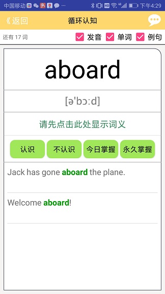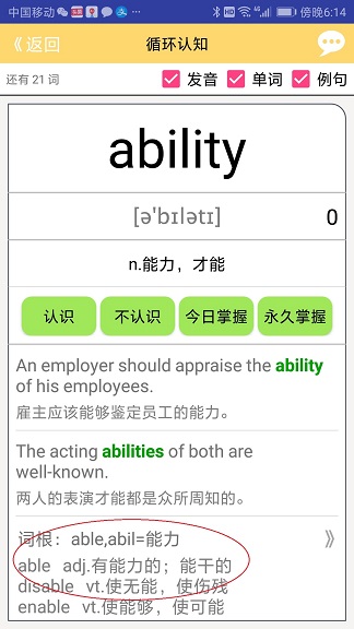 左图和中图为“循环认知”界面,对出现的单词,您只需选“认识”或“不认识”,不认知的单词会反复出现,并且定期要求复习。越不熟悉的单词,出现越频繁。高效的复习手段,是背单词的关键!认知时可以选择要或者不要例句提示,因为有时在上下文中能认出单词,就足够了!