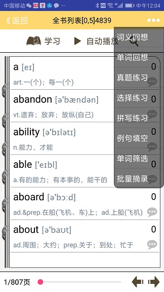 单词列表中,可以选择“自动浏览”、“选择练习”、“词义回想”、“单词回想”、“拼写练习”、“例句填空”等多种手段学习,并可随意挑选单词摘录到自建书本;还有“单词筛选”让您自由挑选单词,彻底避免重复学习已熟悉单词